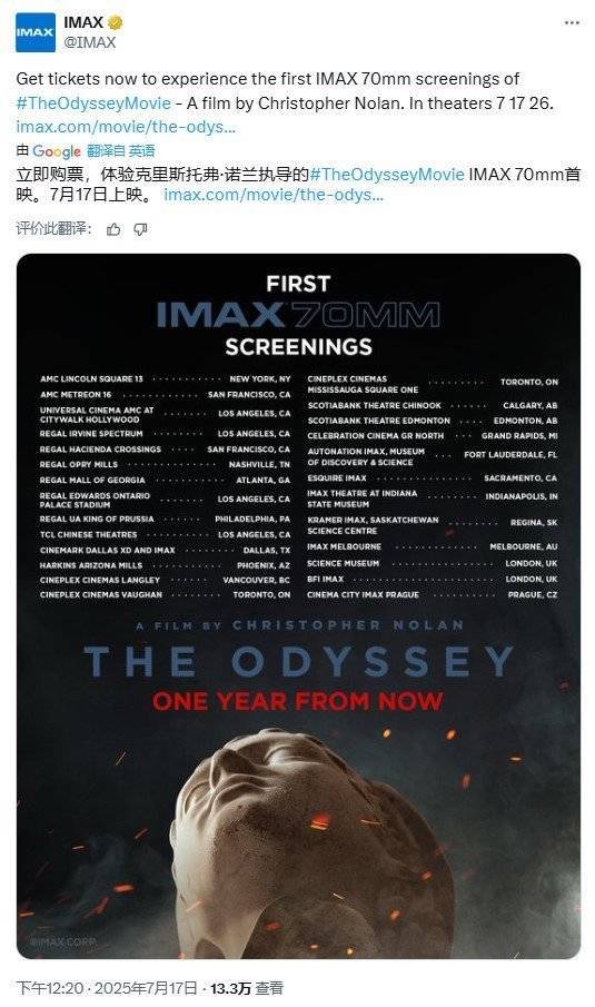 克里斯托弗·诺兰执导的史诗巨制《奥德赛》在距上映整整一年之际(2025年7月17日)转眼开启预售开yun体育网,北好意思首批70毫米IMAX场次在五分钟内被抢购一空。