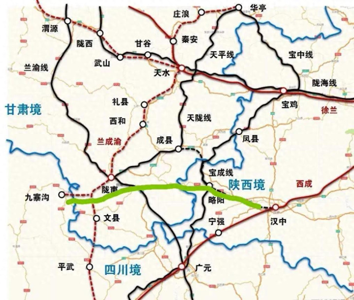 澄莹决议,起自汉中站(与西成高铁并站),经勉县、略阳插足甘肃陇南康县、武王人区,再跨白龙江插足四川阿坝州九寨沟县,绝顶接入在建川青铁路九寨沟站,全长约280 km,其中陕西段95 km、甘肃段120 km、四川段45 km。