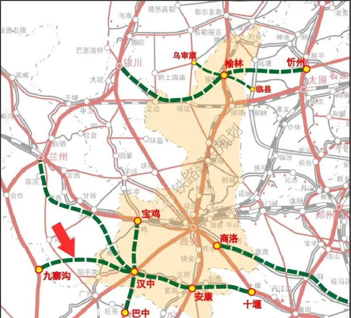 “汉中—九寨沟高铁”(简称“汉九高铁”)是陕甘川三省聚合鼓动的跨省客运专线,定位为“大九寨旅游环线”中枢构成和西部高铁网横向加密线。名目已纳入甘肃省“十四五”抽象交通输送体系发展缠绵,并于2024年4月启动总体决议编制,筹划2025年完成可研、2026年启动勘测遐想。澄莹全长280 km,估算总投资420亿元,遐想时速350 km/h,建成后汉中—九寨沟列车开动时间将由公路7小时压缩至1小时左右,西安—九寨沟裁减至2.5小时,对促进秦巴山区乡村振兴、打造外洋生态旅游目的地具有政策兴趣。
