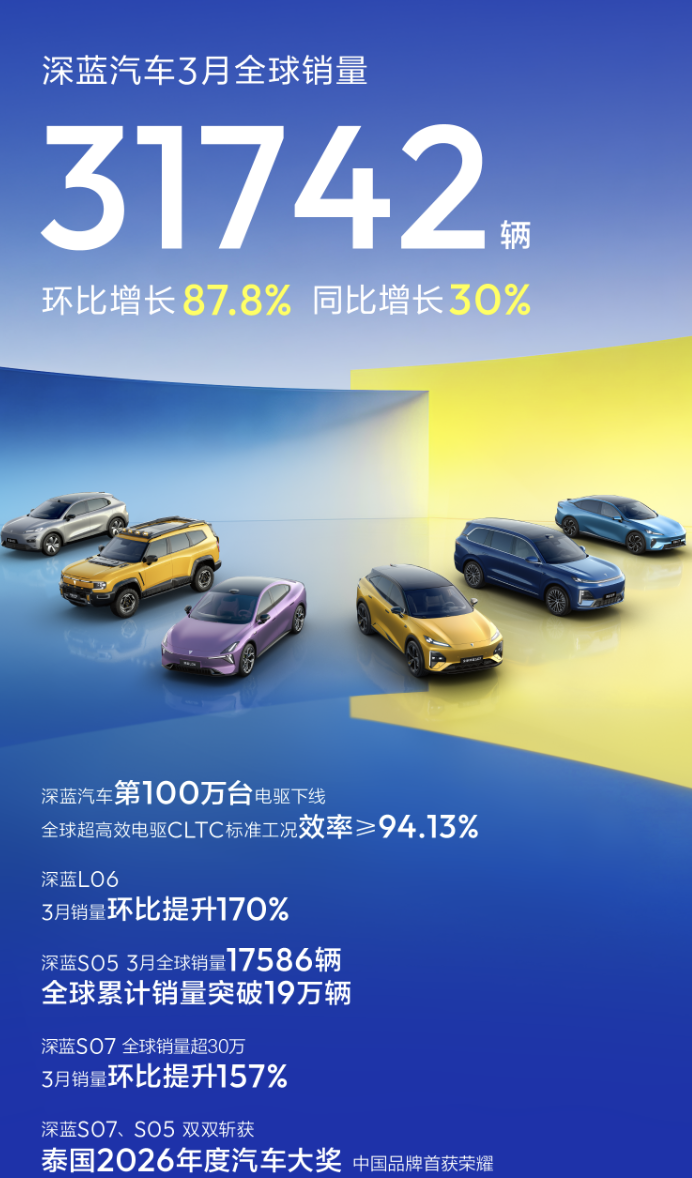 日前,深蓝汽车发布2026年3月人人销量数据,总销量达31742辆,同比增长30%,环比激增87.8%。其中,深蓝S05通晓亮眼,不仅上市以来月均销量褂讪破万,3月销量更是达到17586辆开云(中国)kaiyun网页版登录入口开云体育,人人累计销量已超19万辆;深蓝S07销量也完了逆势上扬,3月销量环比普及157%,人人累计销量打破30万辆;深蓝L06一样通晓不俗,3月销量达5135辆,环比增幅达170%,成为增长新引擎。此外,深蓝S09后驱Ultra超长续航版(25.99 万元)与深蓝 G318四驱萧索版(18.59 万元)迎来双车上新,进一步丰富了家具矩阵,得志不同用户需求。