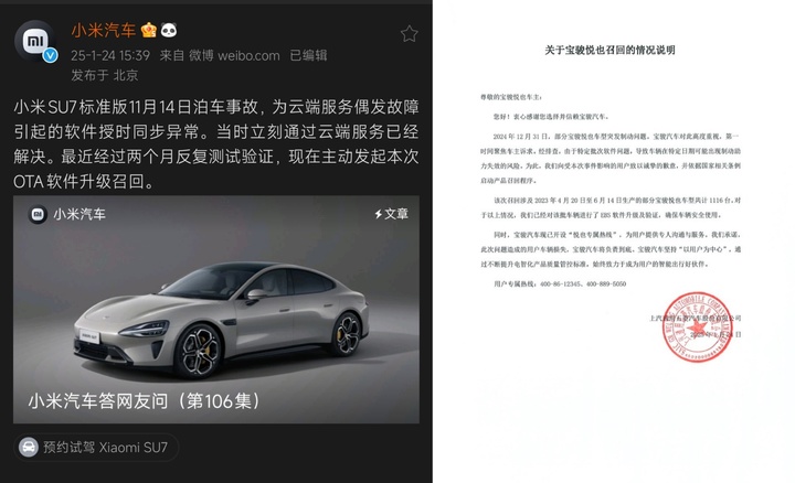 1 月 24 日,小米汽车在第 106 集《小米汽车答网友问》中发布公告,主动向国度阛阓监督经管总局备案小米 SU7 尺度版调回狡计。