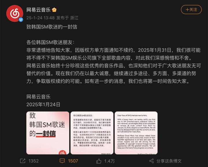 1 月 24 日,网易云音乐发布《致韩国 SM 歌迷的一封信》,并示意异日会因版权问题而下架 SM 旗下全部歌曲内容。