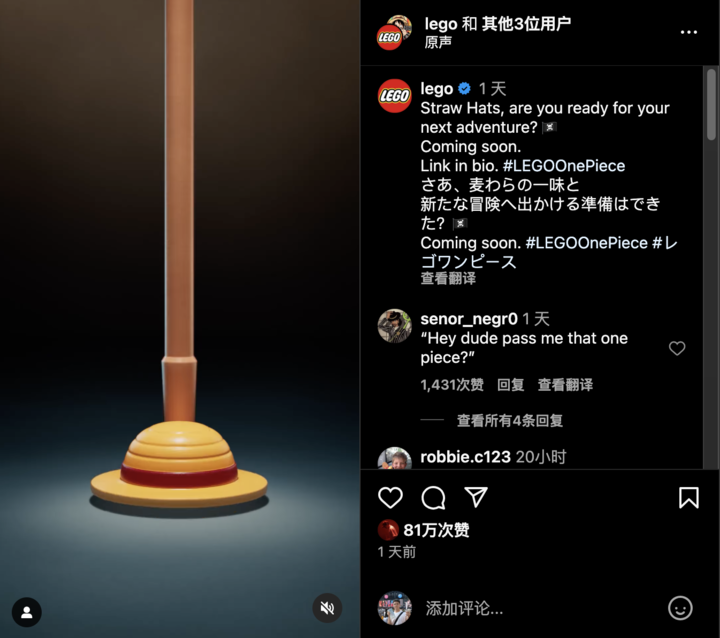 音尘通知后,《海贼王》原作家尾田荣一郎也回应称,我方一直相配喜自得高,我方的责任室里于今还推着数十箱的没来得及拼装的新品乐高模组,并示意 25 年前《海贼王》动画开播时,就期盼着好像被乐高盯上。