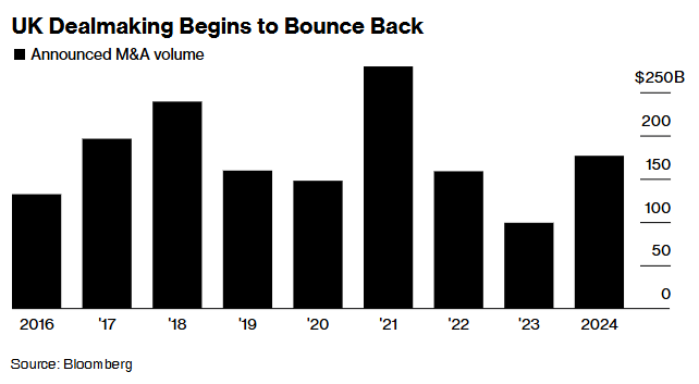 把柄媒体汇编的数据,英国的并购交游照旧运行复苏,本年针对英国公司的并购交游总数增长了82%,达到1770亿好意思元。尽管东说念主们操心英国首相斯塔默的新政府将导致更高的税收和富东说念主离开英国,但英国公司仍迷惑了投资者的深嗜。