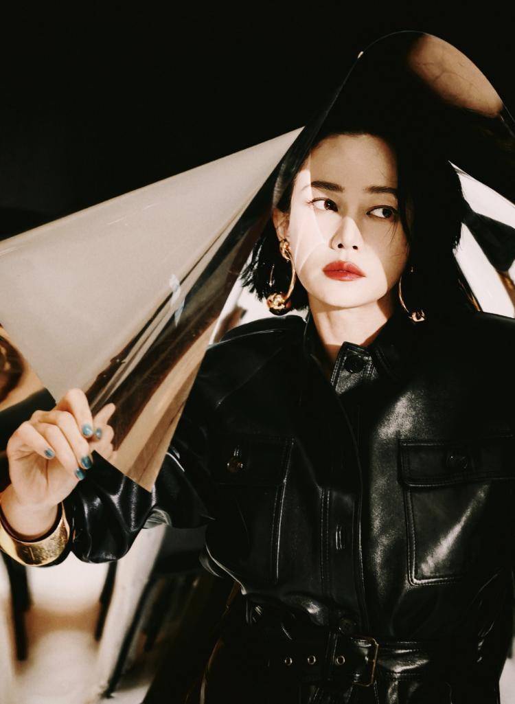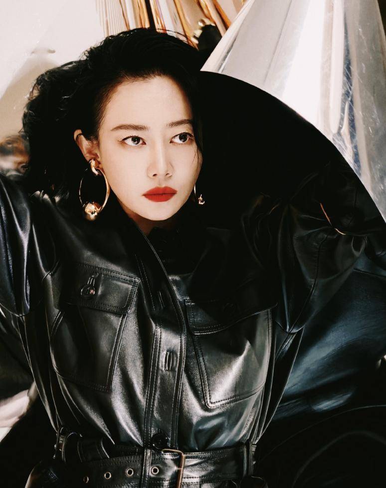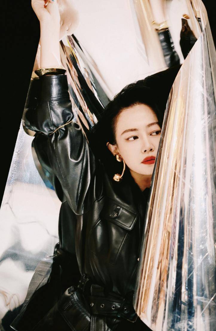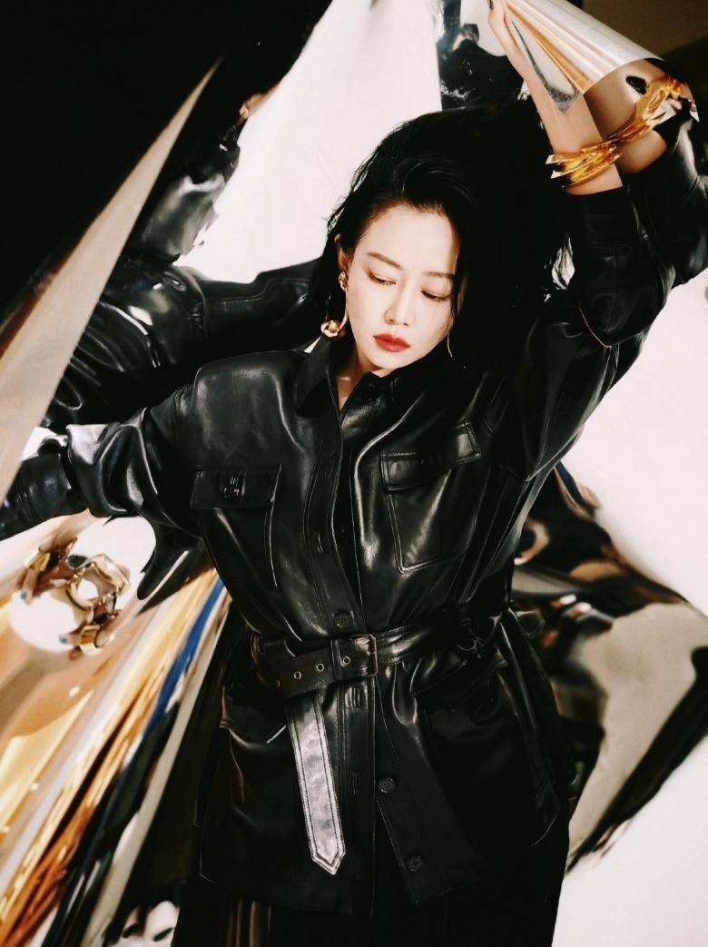 此款系腰带的皮衣外衣,搭配金色耳饰和金色手镯,在显气场方面险些绝了,和谭卓的气质完好契合。