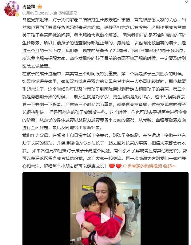 2024年12月,冉莹颖在酬酢平台上示意,她11岁的二犬子皓皓身高仅有136.6厘米,这让身为母亲的她感到极度心焦,临了在大夫的提议下决定给孩子打针滋长激素。