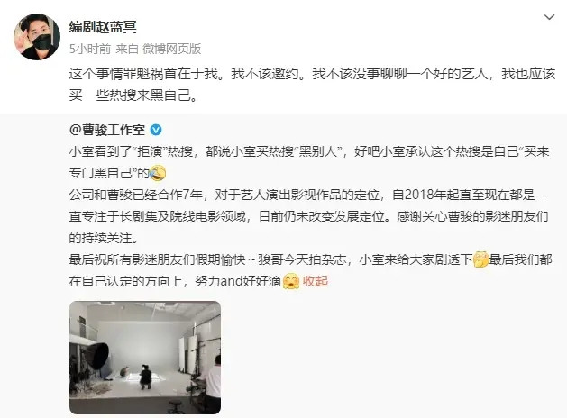 最近文娱圈有个事儿挺有道理——编剧赵蓝冥找意识十年的演员曹骏拍戏,恶果被拒了。这原来是圈内再正常不外的合营摩擦,没思到愣是冲上了热搜。