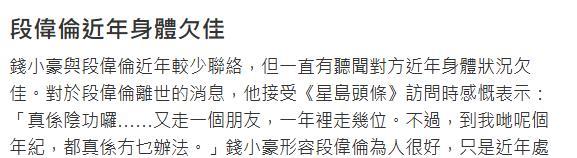 有传段伟伦的死因是肾枯竭,艺东说念主卢惠光受访证明,败露段伟伦的躯壳一直有严重问题,还曾中风,上星期才和段伟伦磋磨,今天接到他弟弟的电话,奉告段伟伦也曾走了。