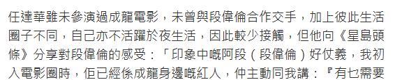 任达华受访惊奇段伟伦为东说念主仗义,他曾是成龙身边的红东说念主,主动提议不错襄理。