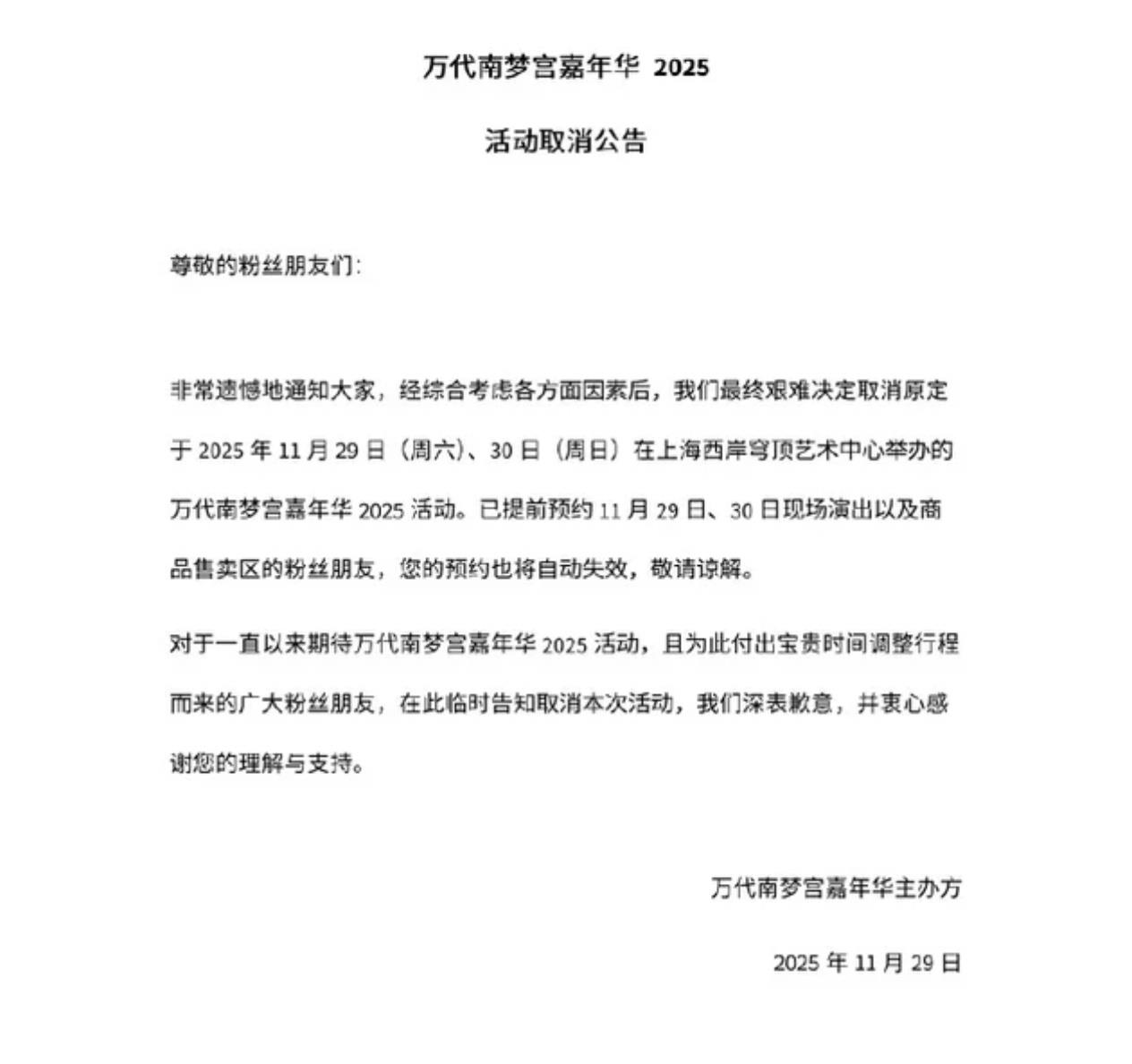 万代南梦宫中国11月29日文告,经审慎评估,决定取消原定于本周末在上海西岸穹顶艺术中心举行的“万代南梦宫嘉年华2025”一说念活动。这次取消波及11月29日、30日两日的统统上演和商品售卖,已预约的粉丝预约将自动失效。