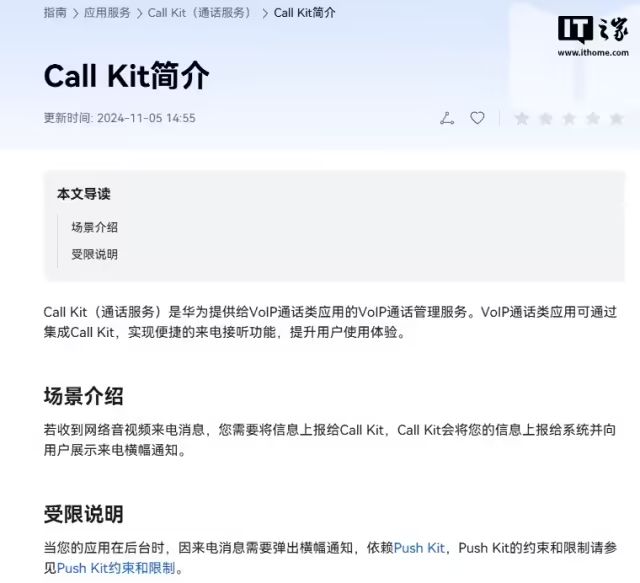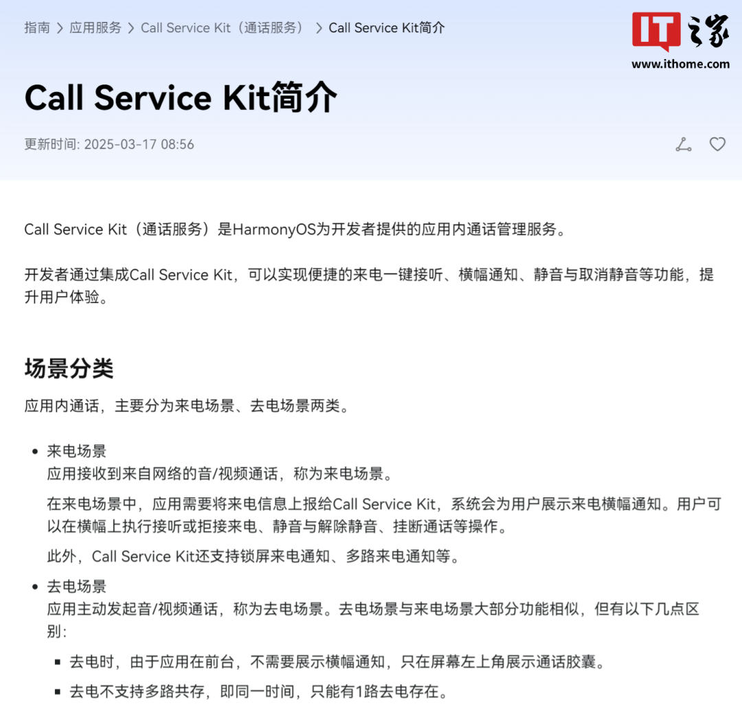 在本年 1 月发布的 API 14 版块中,IT之家小编发现华为蛊惑者定约官网中的“Call Kit”改名为“Call Service Kit”,况兼简介也同步进行了更新: