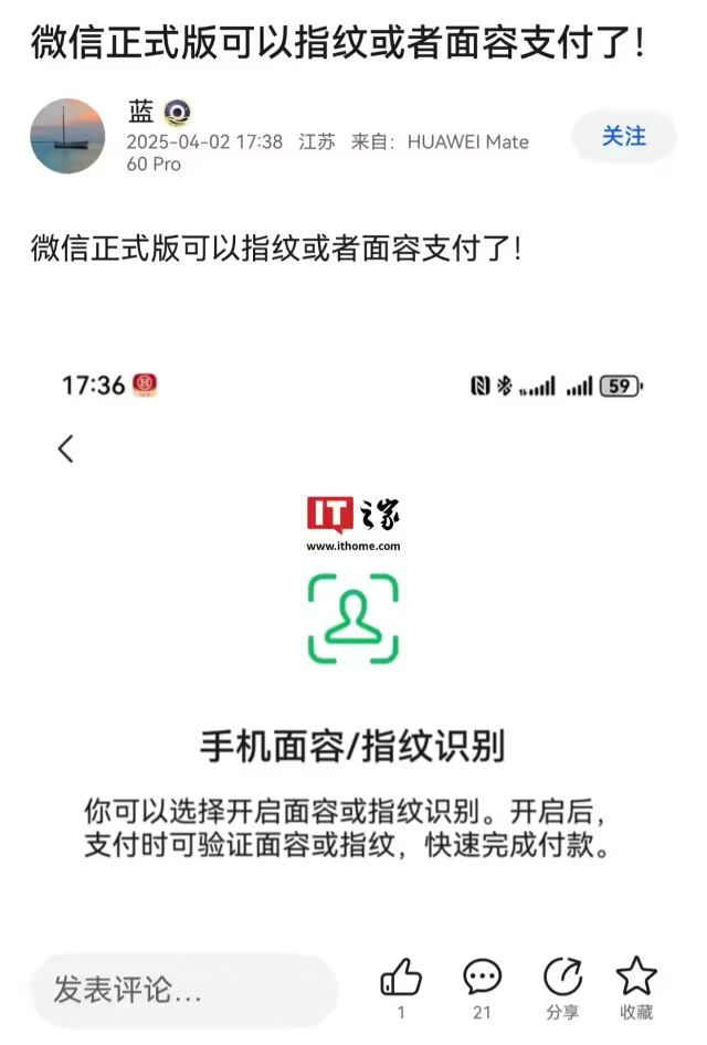 就拿最新的 1.0.5.35 郑再版底本说,有IT之家用户的微信已撑握指纹、样子支付。