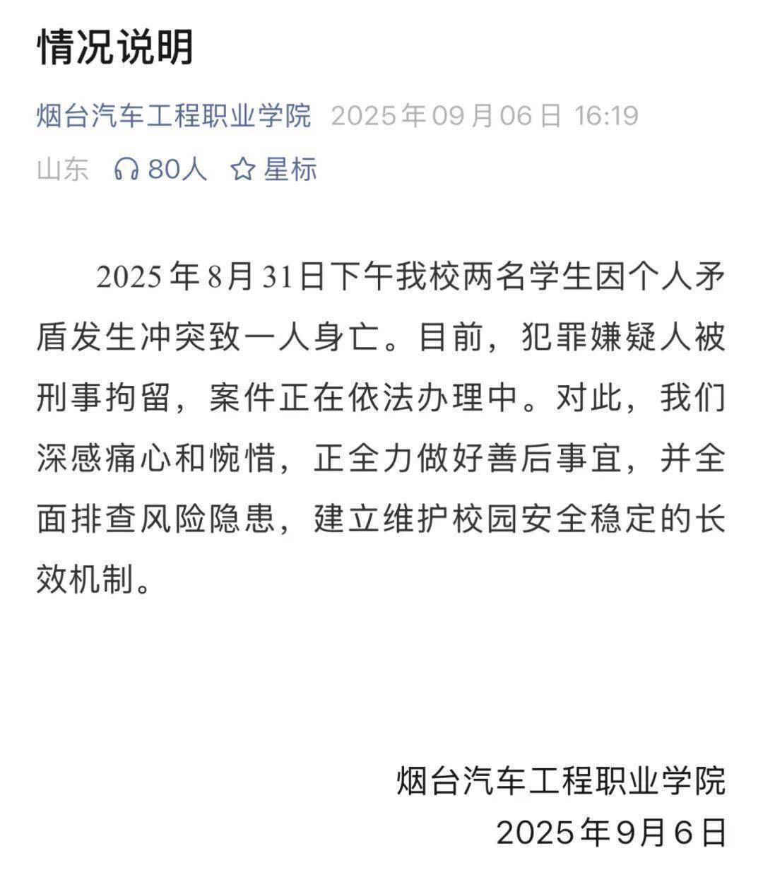 2025年8月31日下昼我校两名学生因个东谈主矛盾发生突破致一东谈主身一火。当今,违法嫌疑东谈主被刑事拘留开yun体育网,案件正在照章办理中。对此开yun体育网,咱们深感酸心和愁然,正全力作念好善后事宜,并全面排查风险隐患,诞生珍惜校园安全踏实的长效机制。开始:烟台汽车工程劳动学院版权包摄原作家 如有侵权请有关删除剪辑:谭敏 审核:王世洋 终审:娄恒保举阅读普京喊话:敢来就打河南新一轮降水将登场!“血月”奇不雅能看到吗?河南省政府新任免一批干部周口市最新东谈主事音问