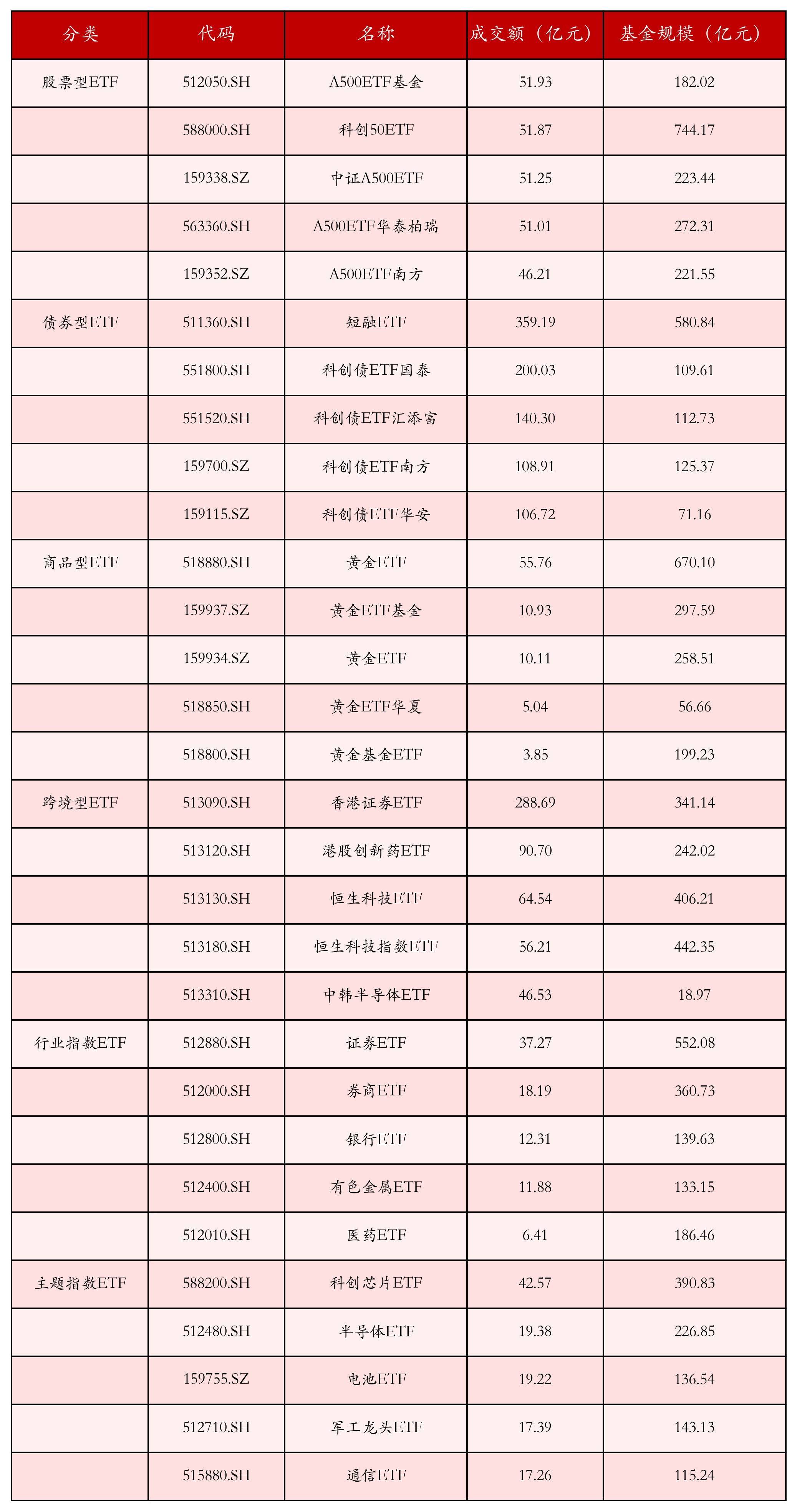 基于成交额对各样ETF当天的成交情况进行统计,成交额靠前的ETF居品如下表所示。股票型ETF中成交额排行前3位的ETF居品分别为A500ETF基金(512050.SH)、科创50ETF(588000.SH)和中证A500ETF(159338.SZ),当天成交额分别为51.93亿元、51.87亿元和51.25亿元。