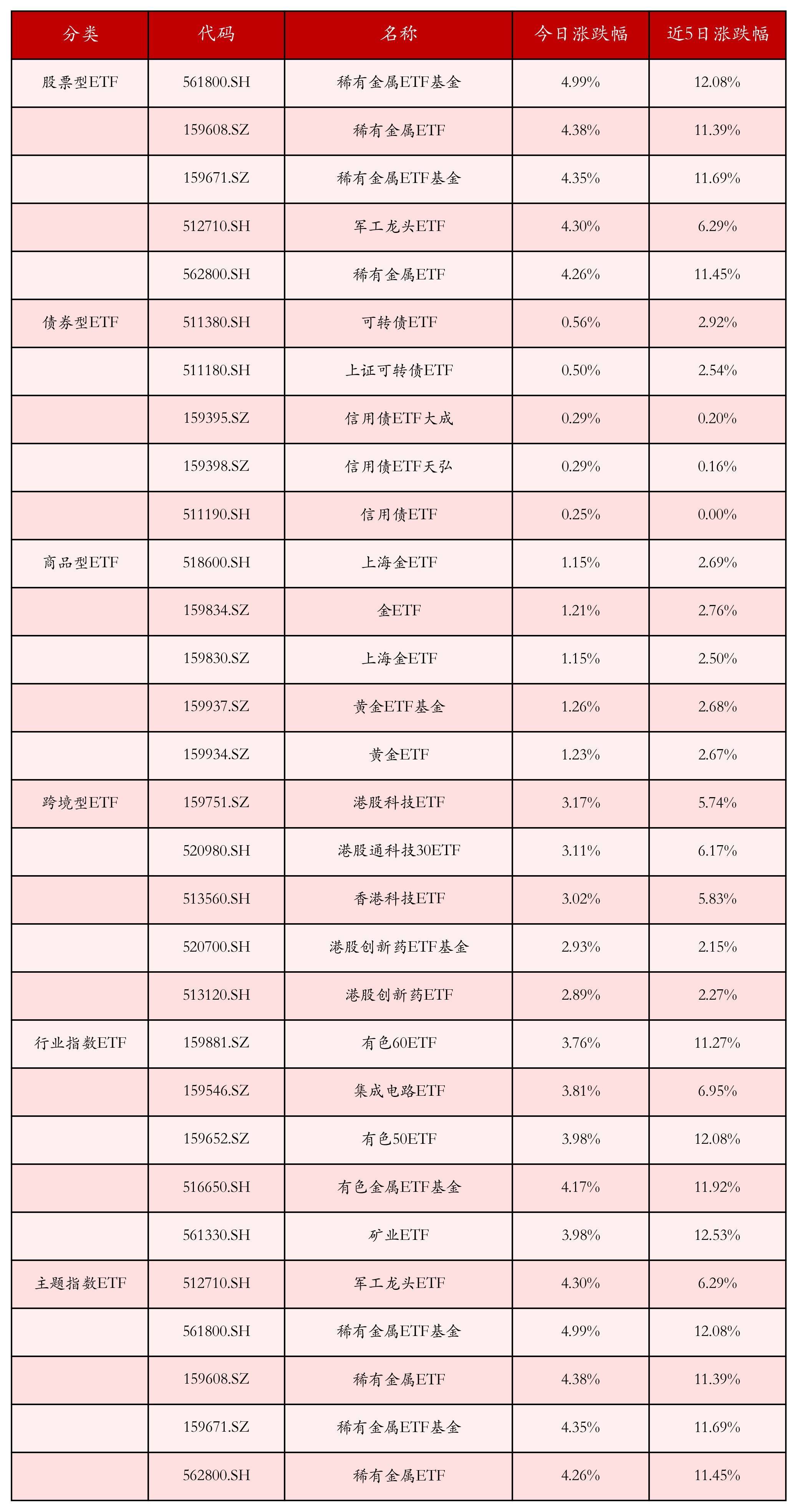 从不同投资种类、行业、主题的ETF居品中找出当天走势行情排行前5的ETF基金,当天涨幅靠前的ETF居品如下表所示。股票型ETF中涨跌幅排行前3位的ETF居品分别为爱戴金属ETF基金(561800.SH)、爱戴金属ETF(159608.SZ)和爱戴金属ETF基金(159671.SZ),当天收益率分别为4.99%、4.38%和4.35%。