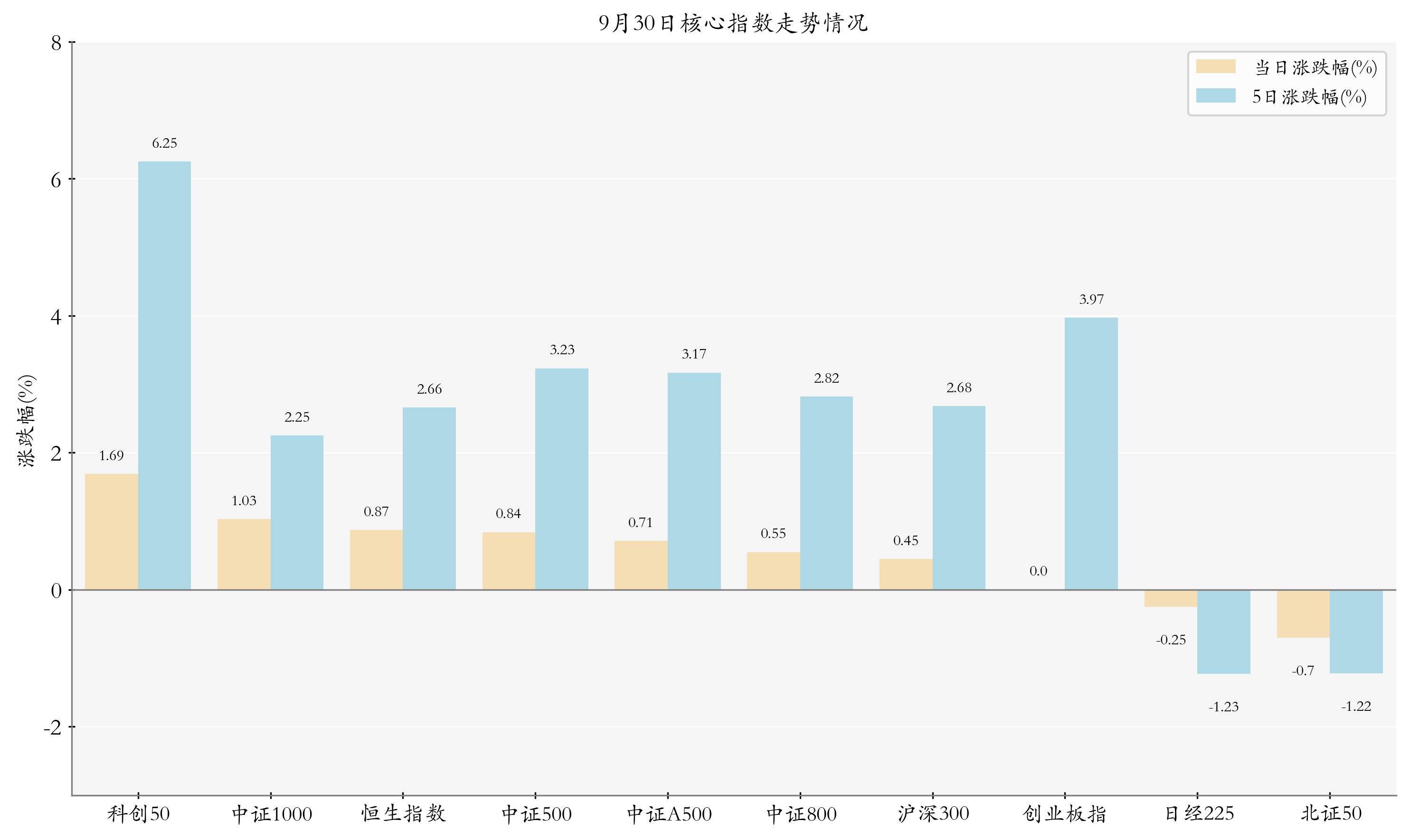 统计A股与国际主要中枢指数走势,当天(9月30日,下同)三大指数涨跌不一,其中上证指数飞腾0.52%,收于3882.78点,日内最高3887.57点;深证成指飞腾0.35%,收于13526.51点,日内最高13598.18点;创业板指较前日收盘价不变,收于3238.16点,日内最高3279.02点。当天科创50、中证1000与恒生指数走势排行靠前,日涨跌幅分别为1.69%、1.03%与0.87%;近5个往翌日科创50、创业板指与中证500的走势排行靠前,近5日涨跌幅分别为6.25%、3.97%与3.23%。