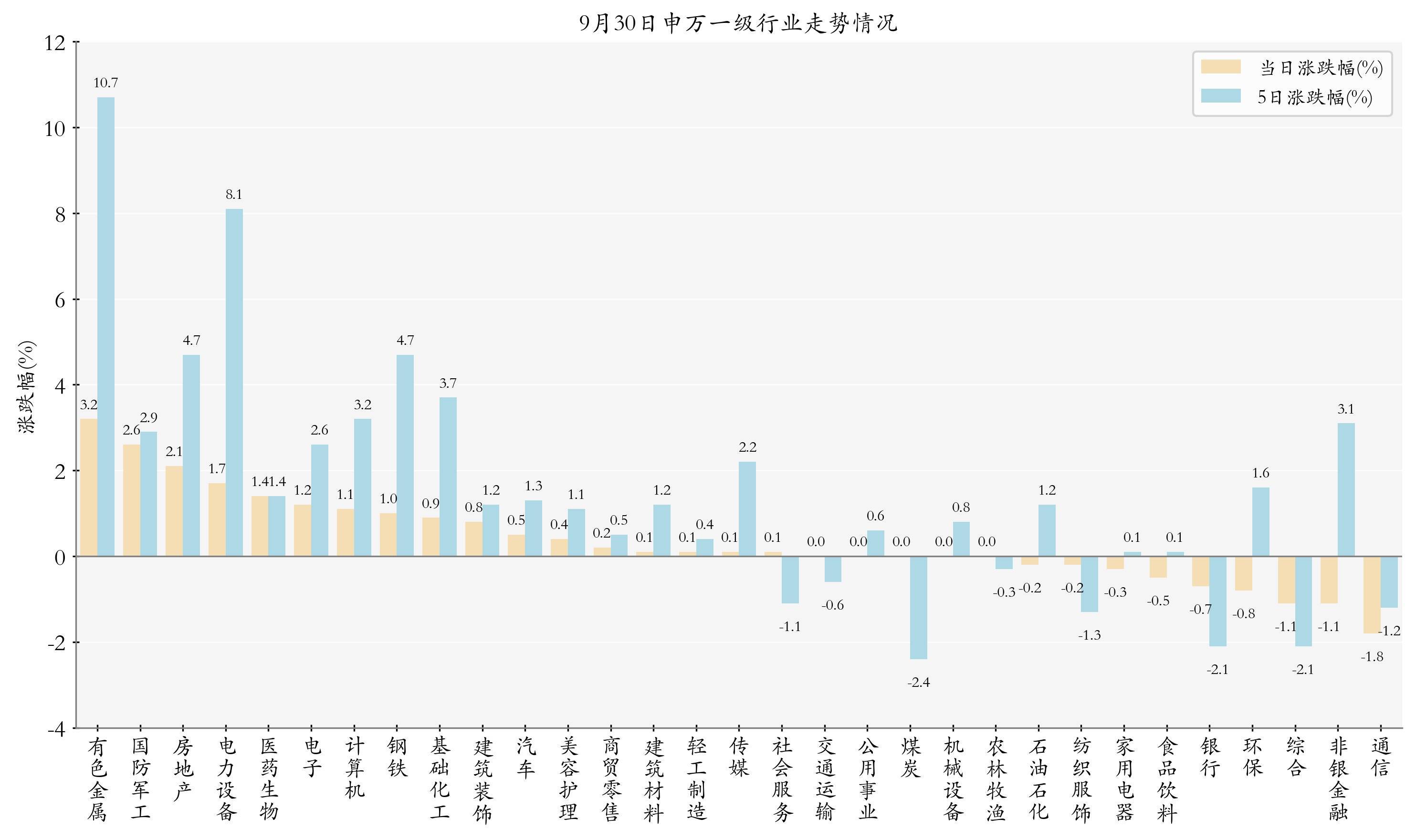 统计当天一起申万一级行业涨跌幅情况,有色金属、国防军工与房地产当天走势排行靠前,日涨跌幅分别为3.22%、2.59%与2.12%,通讯、非银金融与抽象的走势排行靠后,日涨跌幅分别是-1.83%、-1.14%与-1.06%;近5个往翌日有色金属、电力建树与钢铁的走势排行靠前,近5日涨跌幅分别为10.67%、8.13%与4.68%,煤炭、银行与抽象的走势排行靠后,近5日涨跌幅分别为-2.39%、-2.13%与-2.07%。