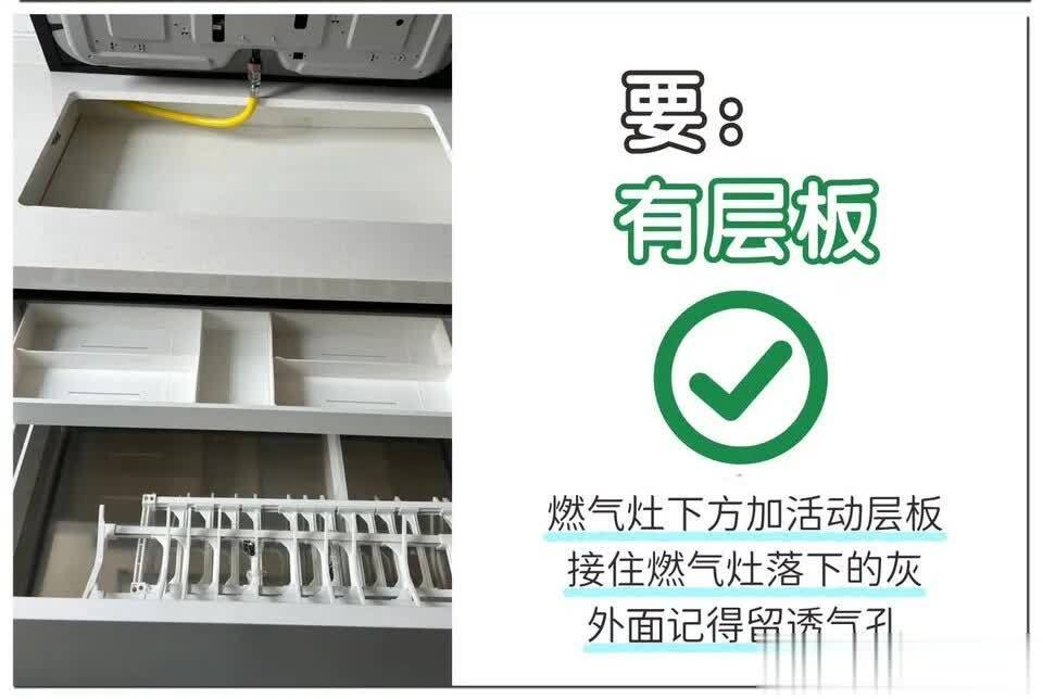 2. 要有层板(燃气灶下):作念活动层板并留透气孔,接灰更卫生。