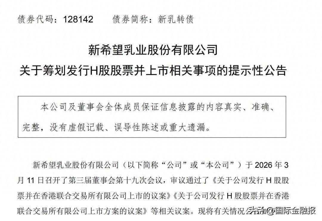 近期,新但愿旗下乳品上市公司新乳业(002946)发布公告,为知足业务发展需要、真切鼓励国际化计策、打造国际化成本运作平台,进一步进步成本实力,经董事会审议通过,拟刊行境外上市外资股(H股)股票并在港交所主板挂牌上市。
